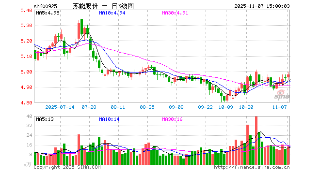 苏能股份收于5.610元,涨幅5.45%,成交金额3.6337亿元,换手率4.08%。