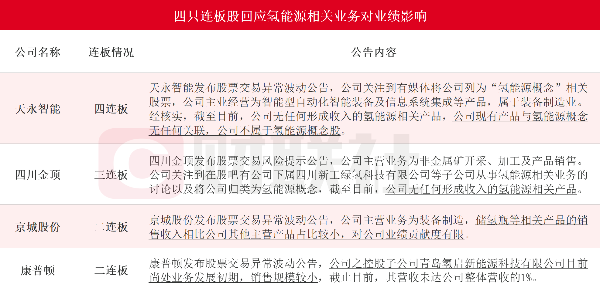 【多只A股氢能源连板股公告对业绩影响 十余家上市公司互动易回复相关业务情况】盘后包括天永智能、四川金顶、京城股份和康普顿在内的四只连板股回应氢能源相关业务对业绩的影响。其中,天永智能公告,公司无任何形成收入的氢能源相关产品。京城股份公告,公司之控股子公司青岛氢启新能源科技有限公司目前尚处业务发展初期,销售规模较小,截止目前,其营收未达公司整体营收的1%。据不完全统计,大洋电机、昇辉科技、和远气体、南都电源、江苏神通、东岳硅材、山东海化、力源科技、蜀道装备和石化机械在内的10家上市公司今日在互动易等平台回复氢能源相关业务情况。此外,三一重工、渝三峡A、海得控制、电投产融和光大嘉宝在内的5家上市公司在互动平台回复无氢能源相关业务。