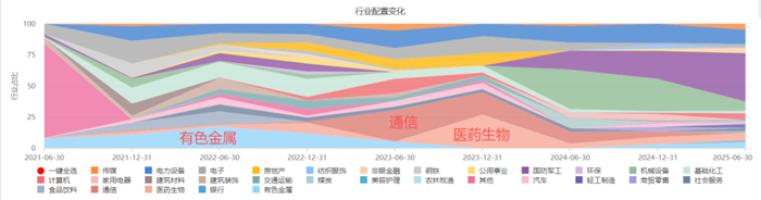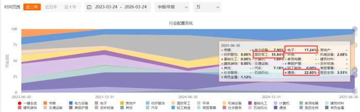 但接任永赢科技驱动以来,行业配置集中度显著提升,2025年中报,国防军工、通信、电子配置权重分别为35.84%、22.8%和17.24%,合计为75.8%。