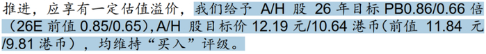 华泰证券给予建设银行A/H股2026年目标PB 0.86/0.66倍,A/H股目标价12.19元/10.64港元,均维持“买入”评级。
