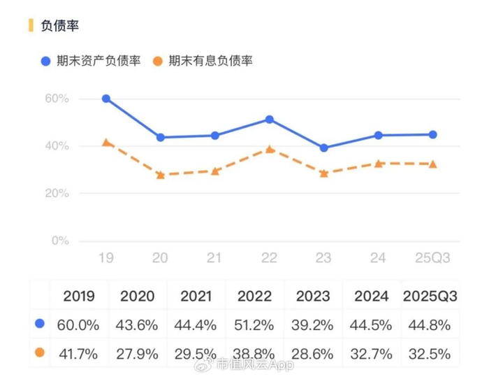 2024年末公司资产负债率44.5%,2025年三季度末,资产负债率为44.8%,有息负债率为32.5%,财务杠杆较高,但并未进一步提高。