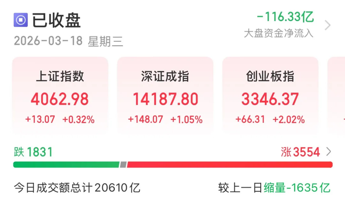 三大指数集体收红,沪指终结日线4连阴,深成指涨逾1%,创业板指涨超2%。沪深两市成交额2.05万亿,较上一个交易日缩量1618亿。