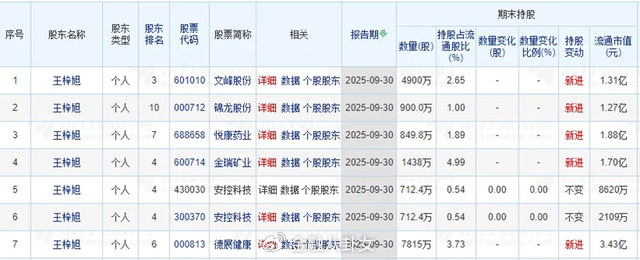 截至2025年9月30日,王梓旭持股名单如下图所示,以这6家公司当前的股价估算,其持股市值合计约10亿元。
