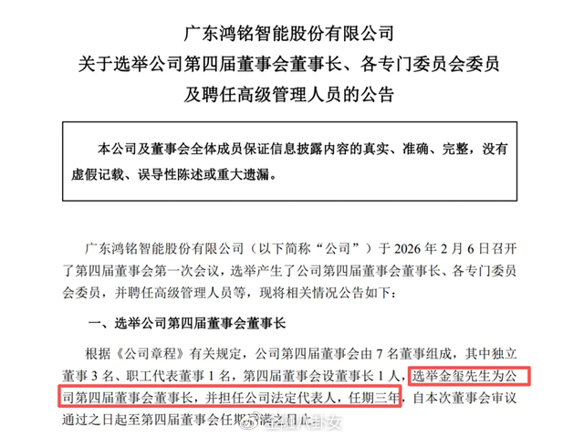 就在2月份,鸿铭股份发布公告,公司2月6日召开了第四届董事会第一次会议,选举产生了公司第四届董事会董事长、各专门委员会委员,并聘任高级管理人员等。其中,选举金玺为公司第四届董事会董事长,并担任公司法定代表人,任期三年。同时,聘任金玺为公司总经理,任期三年。