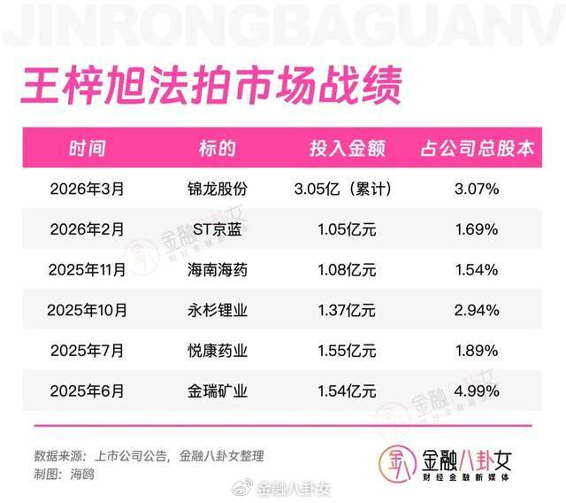 就在上周,锦龙股份实控人杨志茂之妻朱凤廉持有的6300万股,在京东司法拍卖平台结束第二次司法拍卖,王梓旭以约1.05亿元竞得1050万股。从去年到现在,王梓旭参加锦龙股份司法拍卖已有4次,到现在合计花了3.05亿元,累计拍得2750万股。