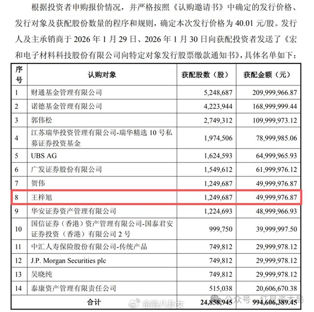 三年前跟彭浩一起定增普利特,最近和王梓旭一起定增宏和科技的投资人名单中,都有瑞银、诺德基金和郭伟松,看来是这些个机构和大哥们,就爱“带着”年轻人一起发财。