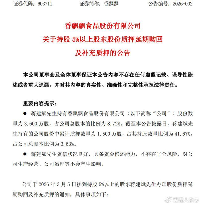 3 月 5 日,香飘飘(603711)发布公告,公司持股 5% 以上股东蒋建斌对其所持股份进行延期购回及补充质押,在公司业绩持续承压、股价长期低迷的背景下,这一操作再度引发市场对其经营与资本状况的关注。