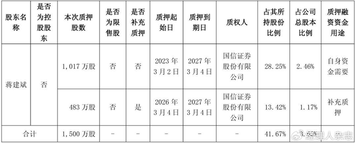 截至目前,蒋建斌累计质押股份 1500 万股,占其持股总数的 41.67%,占公司总股本的 3.63%。公告同时提示,本次质押股份未被用作重大资产重组业绩补偿等事项的担保,蒋建斌的一致行动人亦不存在股份质押情形。