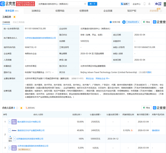 企查查APP显示,近日,北京捷成长旅科技中心(有限合伙)成立,出资额5000万元,经营范围包含:电影摄制服务;电影制片;版权代理;知识产权服务(专利代理服务除外);商标代理等。企查查股权穿透显示,该企业由陵水莲歌文化艺术有限公司、捷成股份(300182)全资子公司捷成世纪文化产业集团有限公司等共同持股。