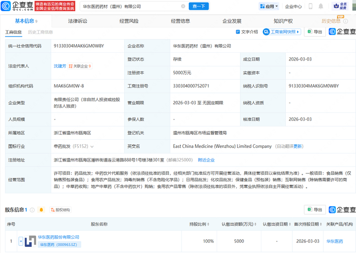 企查查APP显示,近日,华东医药药材(温州)有限公司成立,法定代表人为沈建芳,注册资本为5000万元,经营范围包含:药品批发;中药饮片代煎服务;保健食品(预包装)销售;中草药收购等。企查查股权穿透显示,该公司由华东医药(000963)全资持股。