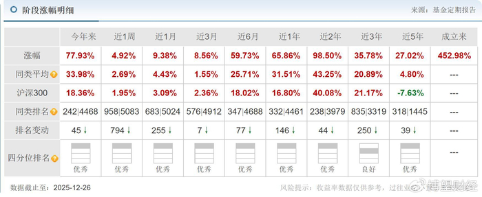 笔者还发现,新华趋势领航混合业绩也不错,2025 年的业绩表现堪称亮眼,该基金成立于2013年9月11日,截至12月26日基金单位净值3.5678,自基金成立来收益率452.98%,今年来收益率77.93%,近 6 月来收益率59.73%,近 1年来收益率 65.86%,近2年来收益率98.50%,近3年来收益率35.78%,近5年来收益率27.02%。