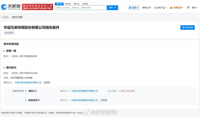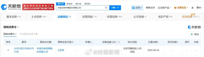 【#华谊兄弟及王忠军被限消# 此前已被执行1140万】#华谊兄弟因1140万案款被限消#天眼查法律诉讼信息显示,近日,华谊兄弟(300027)及其法定代表人王忠军新增一则限制消费令,涉及广告合同纠纷案件,申请人为北京泰睿飞克科技有限公司,执行法院为北京市朝阳区人民法院。案件流程信息显示,此前,该公司已被执行1140万余元。