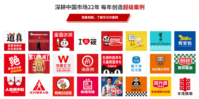根据官网资料,华与华合作客户覆盖互联网、餐饮、茶饮、调味品等细分行业,包括西贝莜面村、海底捞、华莱士、蜜雪冰城、东鹏特饮、江小白、厨邦酱油、新东方、读客文化、得到APP、鸭鸭羽绒服、汉庭酒店、SKG未来健康、阿里巴巴天猫养车、奇安信、新潮传媒等品牌。