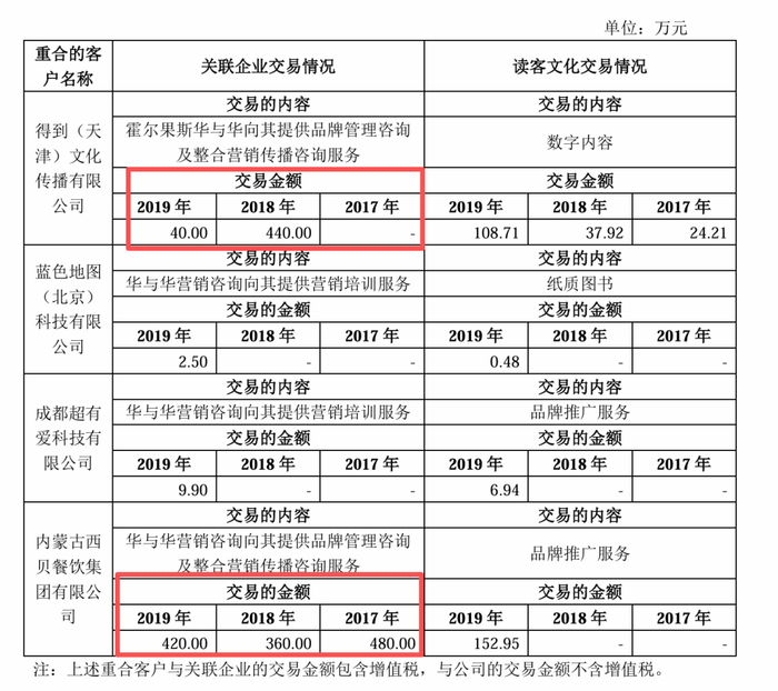 在读客文化申请上市时的一份文件中,《BUG》栏目查询到,西贝和华与华在2017年至2019年的交易费用分别为480万元、360万元和420万元。该文件也刊载了得到与华与华的交易费用,2018年为440万元,2019年为40万元。