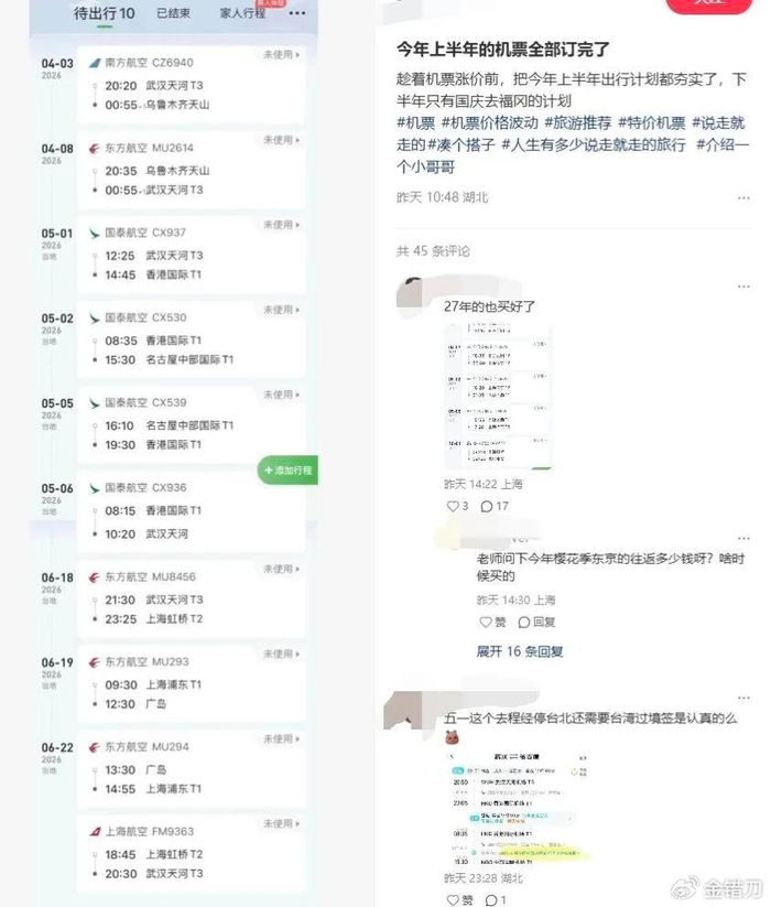 有博主趁着机票涨价前,把今年上半年的机票全部订完了,待出行10条行程,从4月排到6月底,南航飞乌鲁木齐、国泰飞名古屋、东航飞广岛。