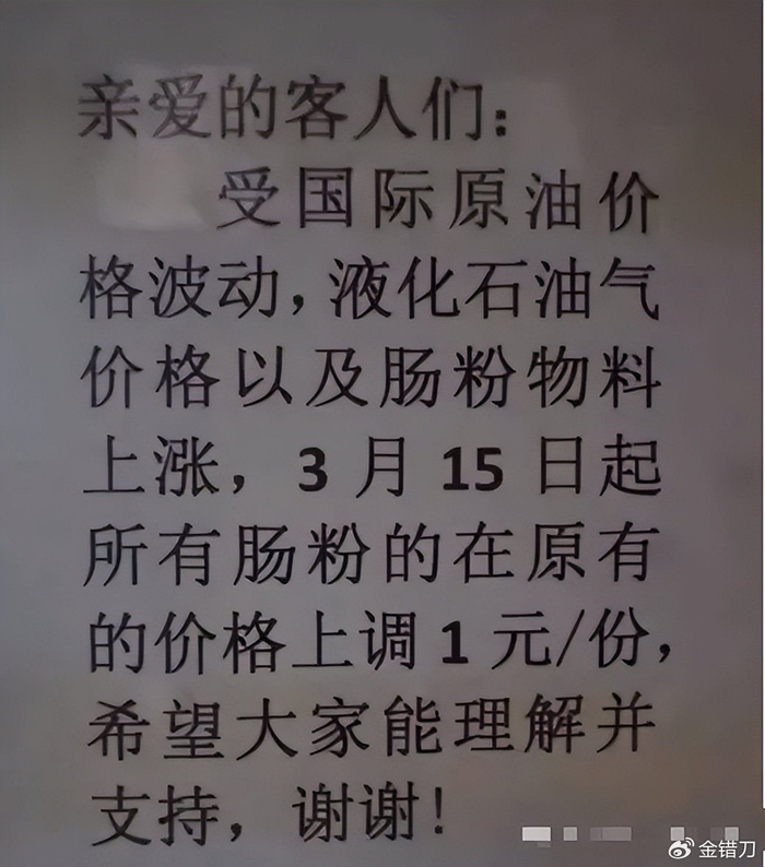 真正让大家破防的不只是油价,上周一张肠粉上调1元的通知单,让不少打工人破防,店主涨价的理由直白又无奈:液化石油气与物料成本上涨。