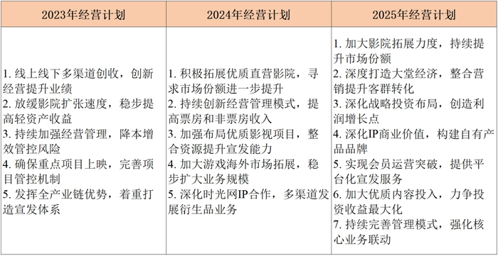 ▲万达电影历年经营计划。新京报贝壳财经记者 阎侠 制图从每年财报披露的经营计划中,也可以窥见“万达时代”和“儒意时代”的不同。万达电影易主后,业务重心渐渐向“渠道+内容协同”的方向进行试探性延伸。其中,IP一词在2024年和2025年的经营计划中被反复提及,而在2025年经营计划中更是直言要“加大优质内容投入”。