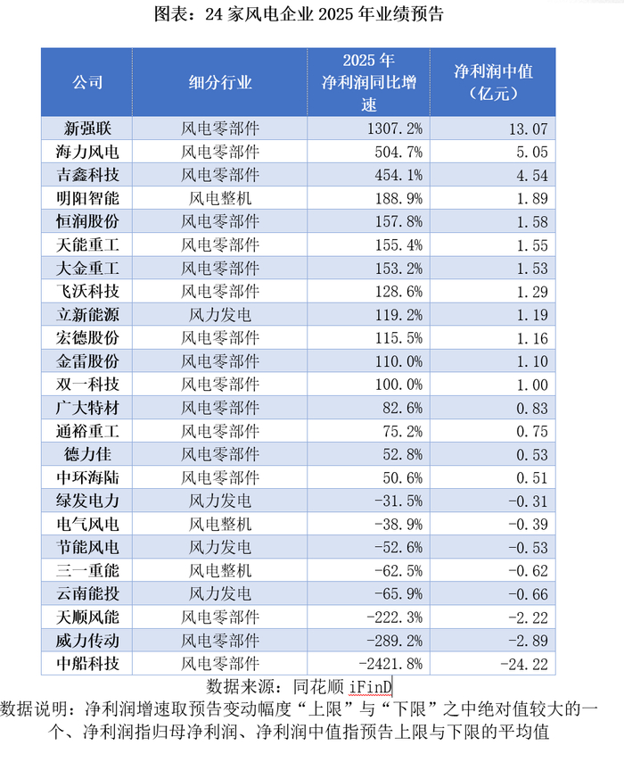 2025年,光伏行业进入深度亏损阶段,9家龙头企业的预亏额合计超过400亿元;同样作为新能源主力赛道,风电这边的风景却大不相同,24家率先披露业绩预告的风电企业,2025年净利润同比增速中位数达91%,其中半数企业翻倍增长。
