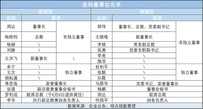 当天晚上,该公司一次性发布了8条公告,大部分都跟董事会有关,当中正式披露了新一届领导班子名单,包括郭伟获任金科股份董事长、总裁、党委副书记,王晓晴任副董事长,周达为联席总裁,李根为常务副总裁,张勇为党委专职副书记,杨鹏为董事会秘书,何鸽平为财务负责人。