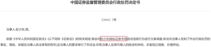 证监会官网显示,近日公布的证监会〔2026〕2号、3号《行政处罚决定书》分别指向操纵证券市场的彭少东、王政。