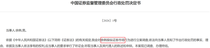 值得注意的是,证监会〔2026〕1号罚单也开给了操纵证券市场的当事人,余韩被“没一罚一”罚没10.22亿元,并被采取“证券市场禁入+证券市场禁止交易”的“双重禁入”措施。