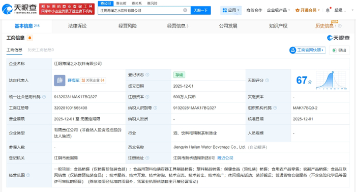 天眼查App显示,近日,江阴海澜之水饮料有限公司成立,法定代表人为薛海军,注册资本500万人民币,经营范围包括食品销售、食品用塑料包装容器工具制品销售、塑料制品销售、保健食品销售等。股东信息显示,该公司由海澜之家品牌管理有限公司全资持股。