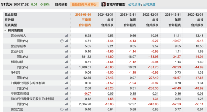 业绩方面,ST先河今年前三季度实现营业收入6.28亿元,同比增长4.71%;归属于母公司所有者的净利润为553.42万元,同比增长2.68%。不过,拉长时间来看,公司业绩表现堪忧。