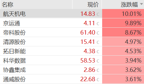 京运通(601908.SH)垂直涨停,最后10分钟成交超昨日全天成交;航天机电(600151.SH)也强势涨停,走出5日4板,股价昨日已创10年新高;帝科股份(300842.SZ)、清源股份(603628.SH)等午后均异动拉升,涨幅居前。