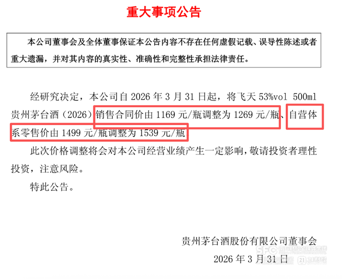 贵州茅台3月30日傍晚公告,经研究决定,本公司自3月31日起,将飞天 53%vol 500ml贵州茅台酒(2026)销售合同价由1169元/瓶调整为1269元/瓶、自营体系零售价由1499元/瓶调整为1539元/瓶。