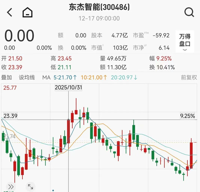 因上述重大资产重组尚存在不确定性,东杰智能股票自12月17日开市起停牌。在二级市场,东杰智能是2025年的“牛股”之一,是机器人概念股,一度创下28.90元的新高。12月16日,东杰智能股价大涨近10%,收报21.59元/股,年初至今,该公司股票涨幅累计达215.64%,最新市值为103亿元。