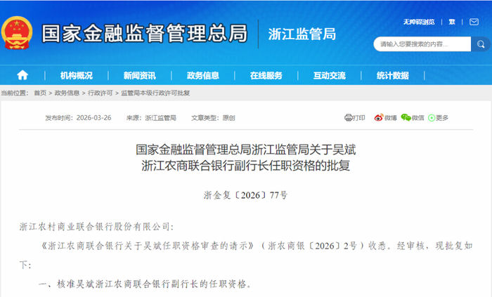 3月26日,浙江金融监管局发布批复,核准吴斌浙江农商联合银行副行长的任职资格。