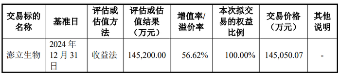 根据东洲评估出具的《资产评估报告》(东洲评报字【2025】第1093号),本次交易对澎立生物采用了收益法、市场法进行评估,最终选用收益法评估结果作为最终评估结论。截至评估基准日2024年12月31日,澎立生物合并报表归属于母公司所有者权益账面价值为92,705.58万元,评估值为145,200.00万元,评估增值52,494.42万元,增值率56.62%。