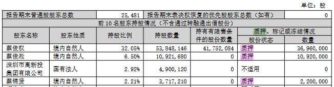 蔡俊权为公司控股股东,实际控制人。蔡俊权、蔡俊淞、蔡锦贤为姐弟关系,三人为一致行动人。截至3季度末,三人合计质押股份50,080,000股,占公司总股本比例30%。