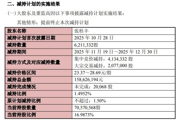 福龙马1月5日发布关于控股股东、实际控制人提前终止减持计划暨减持结果公告。近日,公司收到张桂丰发来的《关于提前终止减持福龙马集团股份有限公司股份暨减持结果的告知函》,截至公告披露日,其通过集中竞价或大宗交易或两者相结合的方式合计减持公司股票6,211,332股,公司总股本1.4952%,并提前终止本次减持计划。本次减持符合承诺的减持数量及时间区间规定。公告显示,2025年11月19日至2025年12月30日,张桂丰减持总金额为158,626,194元。