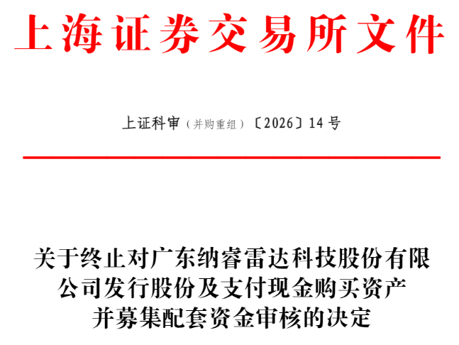 日前,纳睿雷达和独立财务顾问中信证券股份有限公司向上交所提交了《广东纳睿雷达科技股份有限公司关于撤回发行股份及支付现金购买资产并募集配套资金事项申请文件的申请》和《中信证券股份有限公司关于撤回广东纳睿雷达科技股份有限公司发行股份及支付现金购买资产并募集配套资金事项申请文件的申请》,申请撤回申请文件。根据《上海证券交易所上市公司重大资产重组审核规则》第五十二条第二项的有关规定,上交所决定终止对纳睿雷达发行股份及支付现金购买资产并募集配套资金的审核。