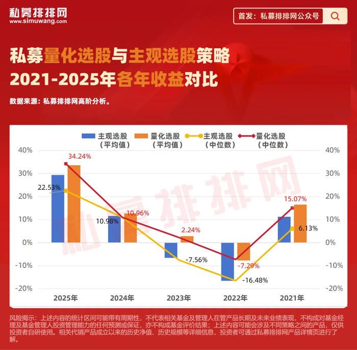 根据私募排排网数据,除在2024年这种转折年份里,量化选股的收益中位数略微跑输主观选股外,其余年份均是量化选股明显跑赢主观选股。若按收益均值来看,过去5年都是量化选股领先。
