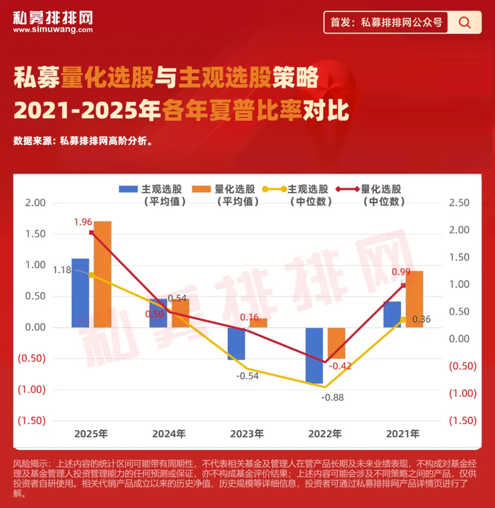 过去5年时间里,2021年、2025年都是结构性牛市,2022-2023年属于熊市行情,2024年则是熊转牛的大波动年份。基于以上优势,在过去5年(2021-2025年),私募基金的量化选股相比主观选股整体展现出了更低的回撤、更高的收益和更高的夏普。