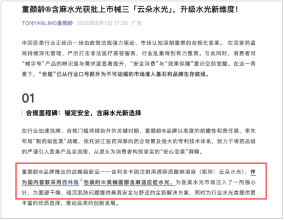 2025年8月7日,童颜龄推出新品“含利多卡因注射用透明质酸钠溶液”,并对外称其为采用西林瓶包装的Ⅲ类含利多卡因面部注射用水光产品。