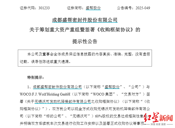 微成都报道 11月18日晚间,成都盛帮密封件股份有限公司(简称“盛帮股份”,301233.SZ)披露的公告显示,该公司与WOCO.F.J.WolfHoldingGmbH(简称“WOCO集团”)于当日签署《关于无锡沃可发动机降噪部件有限公司之收购框架协议》,拟以现金方式收购无锡沃可发动机降噪部件有限公司(简称“无锡沃可”)60%股权。