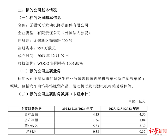 交易标的无锡沃可成立于2003年12月29日,WOCO集团持有其100%股权,主要从事的研发生产业务覆盖传统内燃机汽车和新能源汽车多个领域,包括汽车内饰外饰橡塑产品、发动机以及电驱电机相关总成件等。