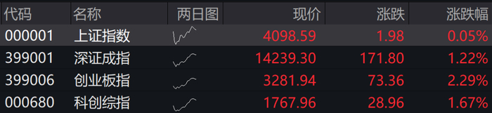 沪指高开0.05%,深成指高开1.22%,创业板指高开2.29%,科创综指高开1.67%。