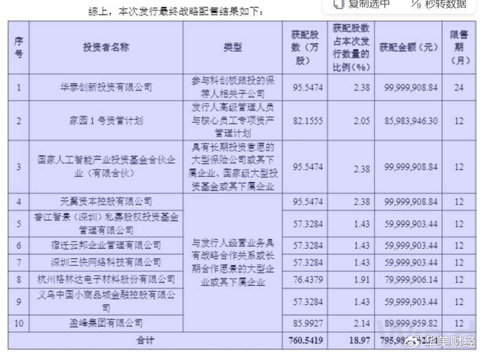 十大股东合计投资大约8亿元,占本次募资金额大约20%;只有华泰创新限售两年,其余股东都限限售一年。