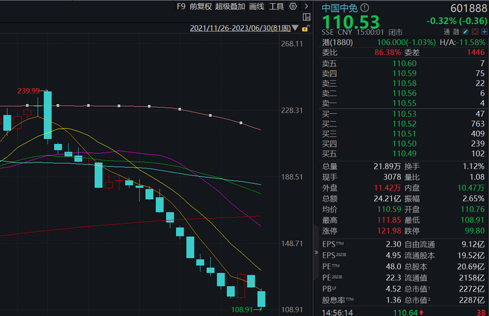 4只千亿龙头股中国中免(601888.SH)、赛伍技术(603212.SH)、隆基绿能(601012.SH)、亿纬锂能(300014.SZ)的上半年跌幅均超过30%。其中,“免税茅”中国中免跌幅最大,为48.84%,总市值较最高点累计蒸发近6000亿元。今年以来,中国中免月线已六连阴,带量杀跌的走势把投资者跌得摸不着头脑。截至最新收盘日,中国中免股价报110.53元,总市值2287亿元,年内市值跌去近2200亿元。