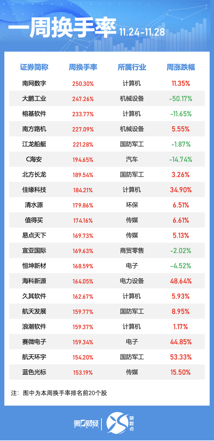 本周五个交易日中有64只个股换手率超过100%。其中,南网数字排名居首,周换手率达到250.30%;此外,大鹏工业、榕基软件、南方路机等4股本周换手率均超200%。