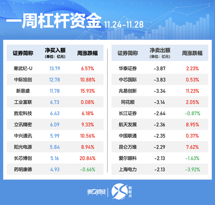 寒武纪-U本周获融资净买入居首,净买入额为13.79亿元。中际旭创、新易盛、工业富联净买入额居前,金额分别为12.78亿元、11.78亿元、6.73亿元;华泰证券、中芯国际、兆易创新遭净卖出额居前,金额均超3亿元。