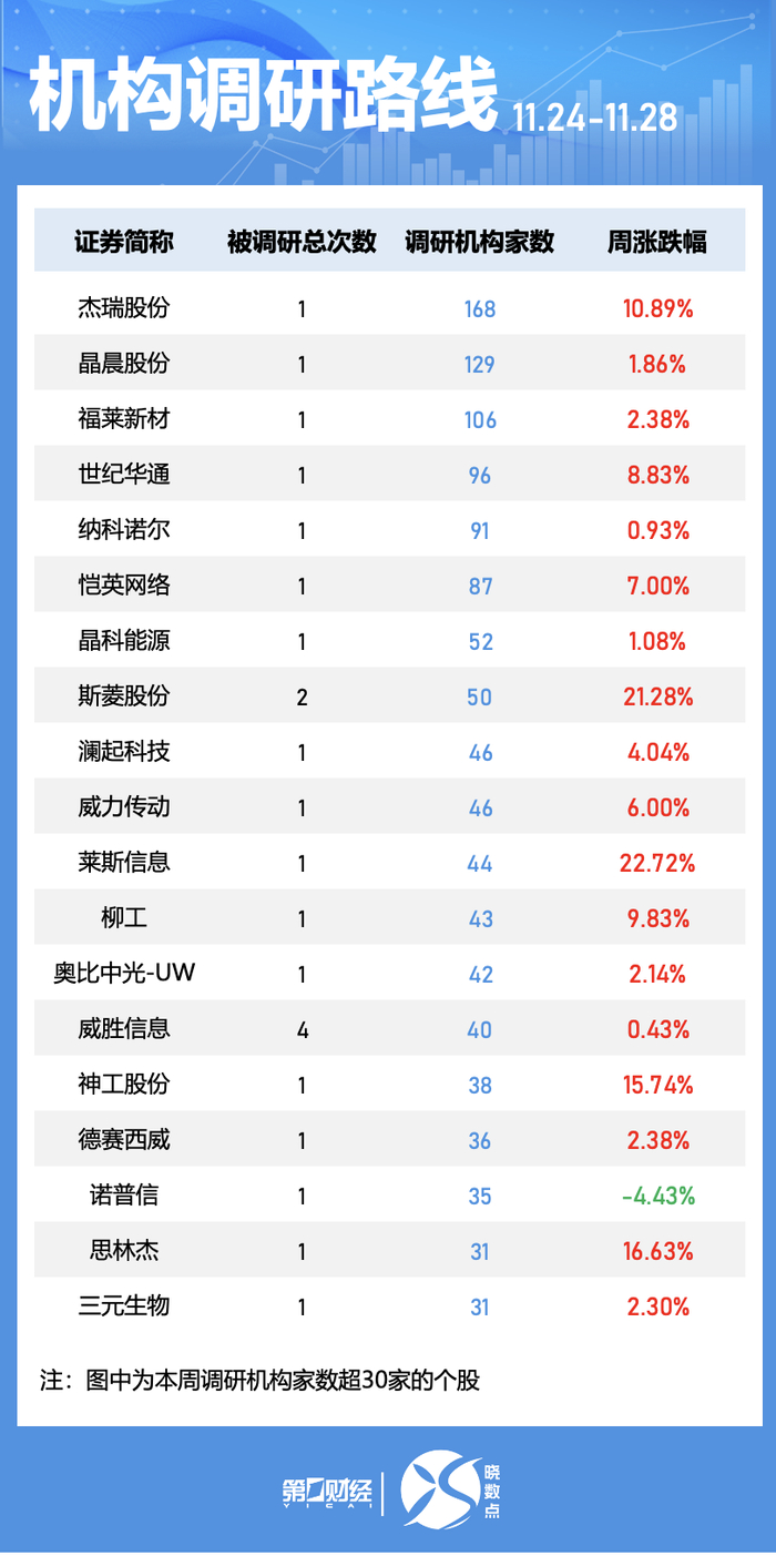 从被调研总次数来看,海峡股份、威胜信息获机构调研4次,斯菱股份、白云机场、伟星股份等14股均获机构调研2次。