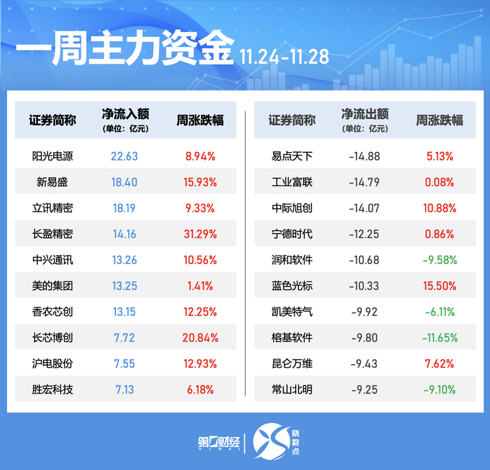 个股方面,本周阳光电源、新易盛、立讯精密获主力净流入居前,分别为22.63亿元、18.4亿元、18.19亿元;净流出方面,易点天下、工业富联、中际旭创遭主力净流出居前,均超14亿元。