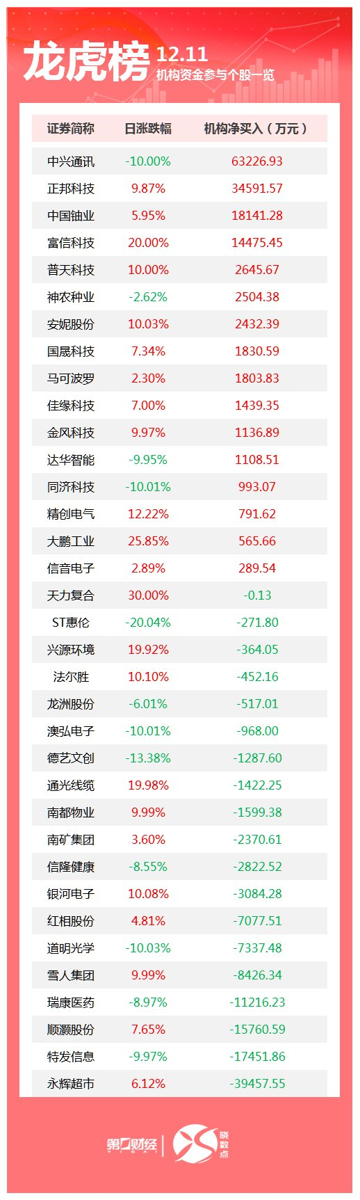 当天机构净买入前三的股票分别是中兴通讯、正邦科技、中国铀业,净买入金额分别是6.32亿元、3.46亿元、1.81亿元。