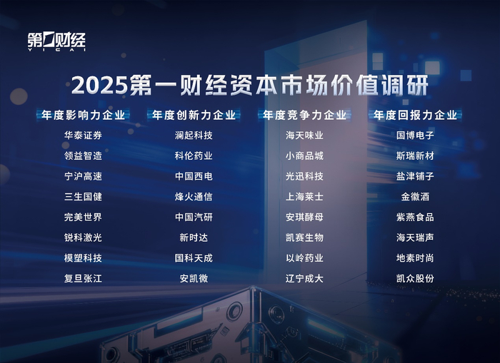 会议最后还发布了2025第一财经资本市场价值调研年度案例,32家上市公司凭借其在各自领域的卓越表现,分别斩获年度影响力企业、年度创新力企业、年度竞争力企业及年度回报力企业四项殊荣。此外,腾讯控股、云迹科技、开普勒三家公司获评“2025第一财经资本年会科创力量年度案例”。