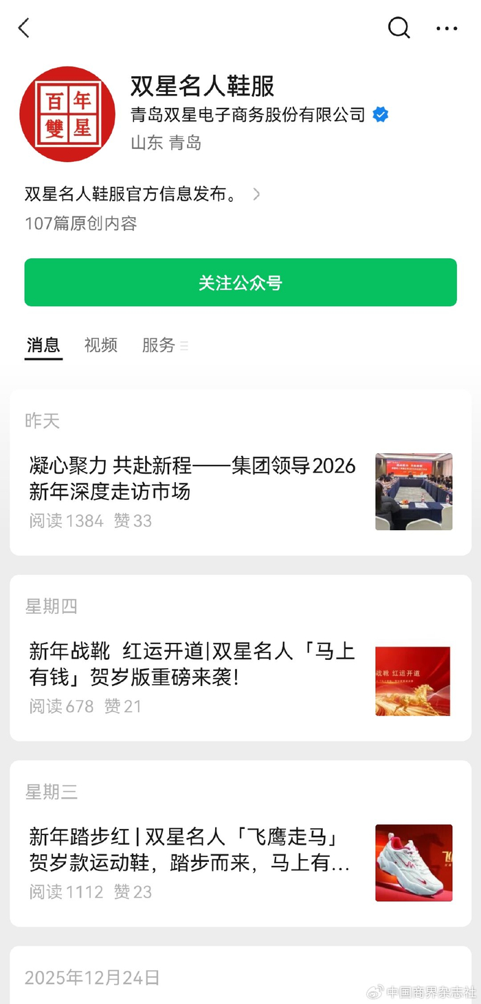 微信公众号账号信息显示,“双星名人鞋服”的认证公司为青岛双星电子商务股份有限公司。企查查显示,该公司的实际控制人为徐英。2025年以前,“双星名人鞋服”账号的推送内容多为企业活动与成就。2025年,该账号开始陆续发布产品信息,如儿童运动鞋、洞洞凉鞋、“面膜裤”、德训系列运动鞋等。2025年9月,账号称双星名人集团“乔迁开业”;同年10月,账号称双星名人临沂旗舰店正式启动试营业,并表示双星名人将以该旗舰店为起点,加快推进终端升级步伐,持续推动门店从形象、面积、体验等多维度实现全面提升,坚决走“开大店、开好店、开形象店”的发展路径,不断强化品牌影响力与市场竞争力。(记者 冉隆楠 于佳鑫)